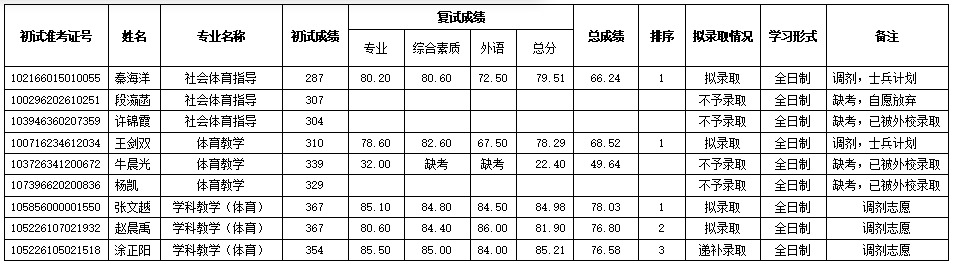 于2026年4月11日组织了体育、学科教学(体育)专业硕士研究生调剂志愿考生复试,现将复试成绩及拟录取情况公示如下: